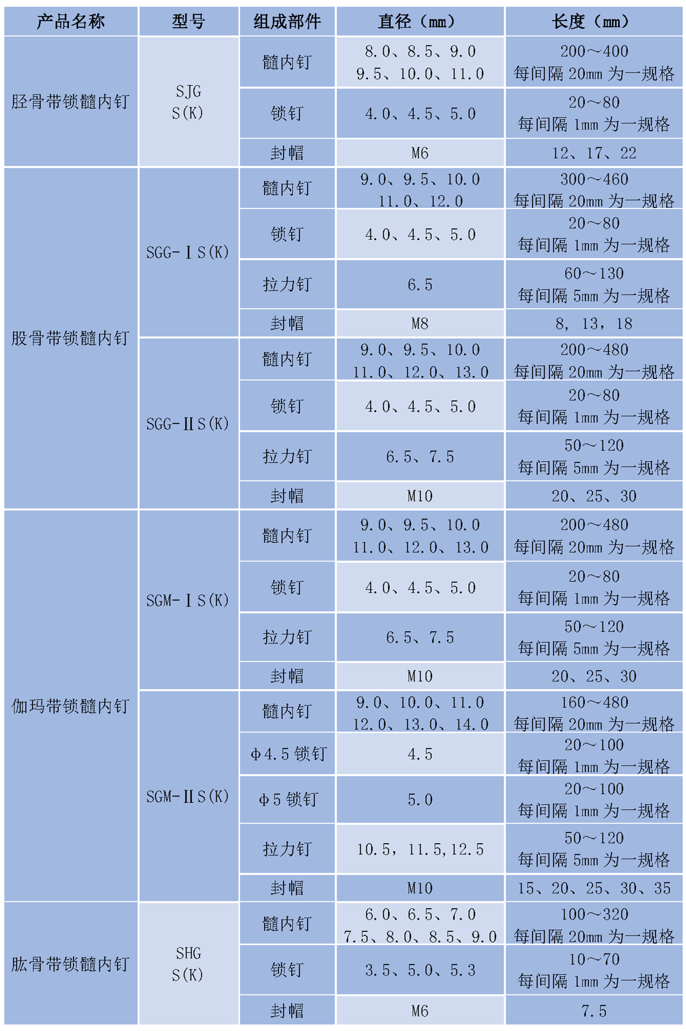 適用于股骨干骨折、股骨近端和干骺端骨折、脛骨干骨折、肱骨干骨折等內固定。